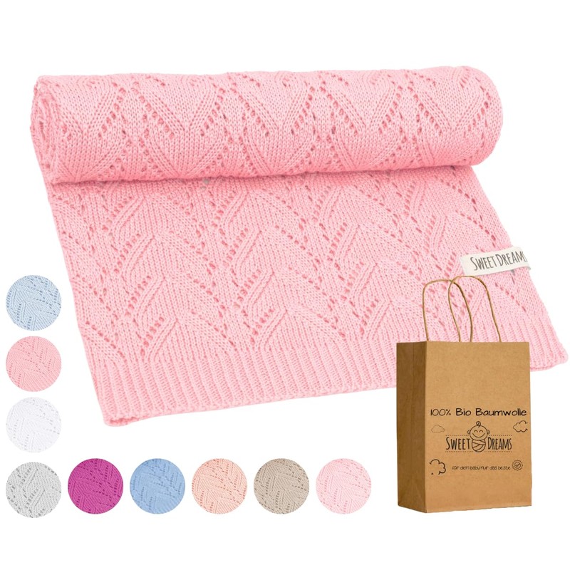 Mikos * 100% Organic Cotton Lightweight Baby Blanket - Ajour Pattern - Perfect for Summer and Spring - Knitted Blanket for Babies, Children and Newborns, Hypoallergenic, 80 x 100 cm (28) (Pink)