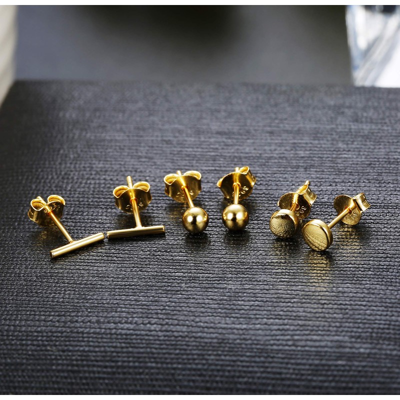 Milacolato 3Pairs 925 Sterling Silver Stud Earrings for Women Girls | 18K Gold Plated Mini Bar Ball Dot Stud Earrings for Cartilage Piercing | Hypoallergenic Dainty Earrings for Women (With Gift Box)