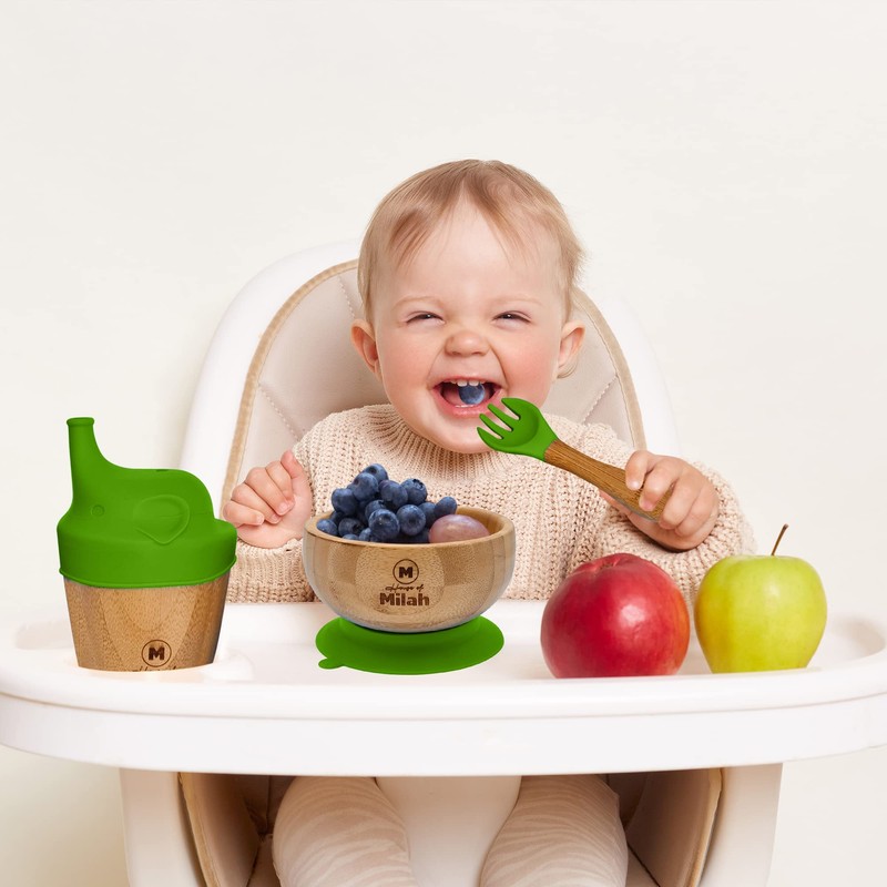 Milah Bamboo Baby I Toddlers Feeding Set l Suction Bowl, Spoon, Fork, Sippy Cup & Matching Bib I Eco Friendly Non Slip Set for Children's First Feeding I Natural Bamboo BPA Free Kids Set (Green)