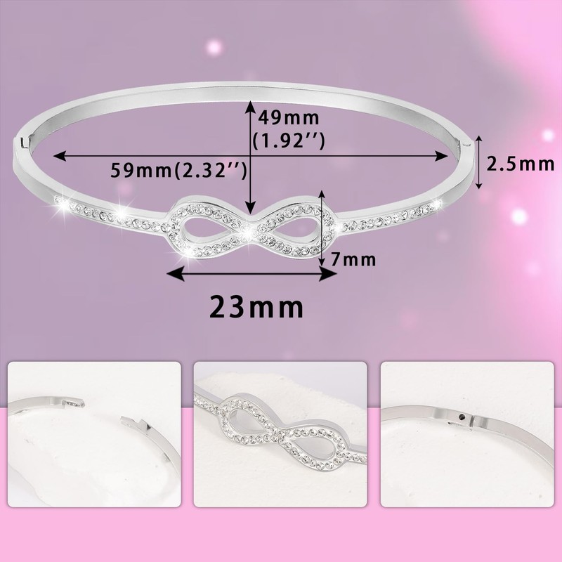 - Design: Infinity love bracelet for women, 2.5 mm stainless steel infinite symbol bangle. Simple design shows the eternity of love, full polishing can bring the comfortable wearing experience. Stainless steel bangle is very cute and robust making a great addition to your fashion style