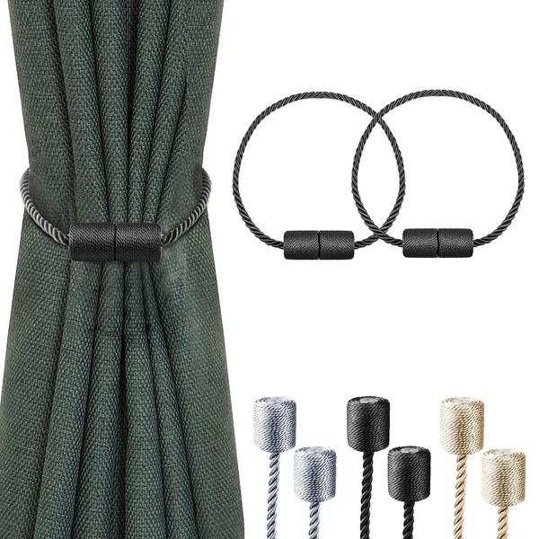 Milaloko 2 Pack Polyester Magnetic Curtain Tiebacks with Thicker Twist Rope, Black