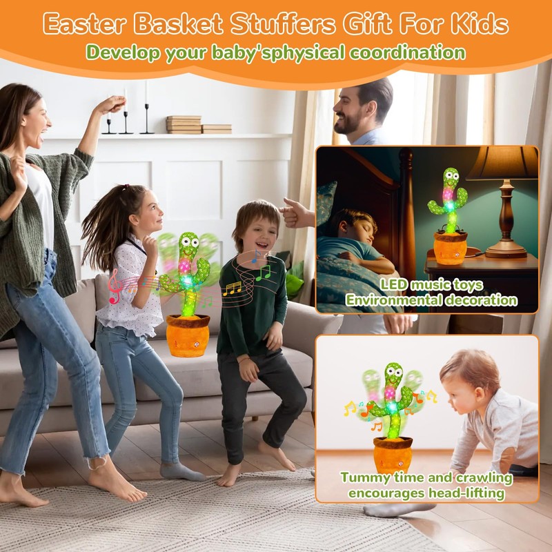 - Education Gift Talking Cactus : singing cactus toy mimic records and repeats what kids say in a humorous and fun way! For example, "Happy birthday! Cultivate your baby's language development. This baby dancing cactus With its comical movements and vibrant lights, it encourages children to wiggle and giggle, enhancing their motor skills and sensory experiences.