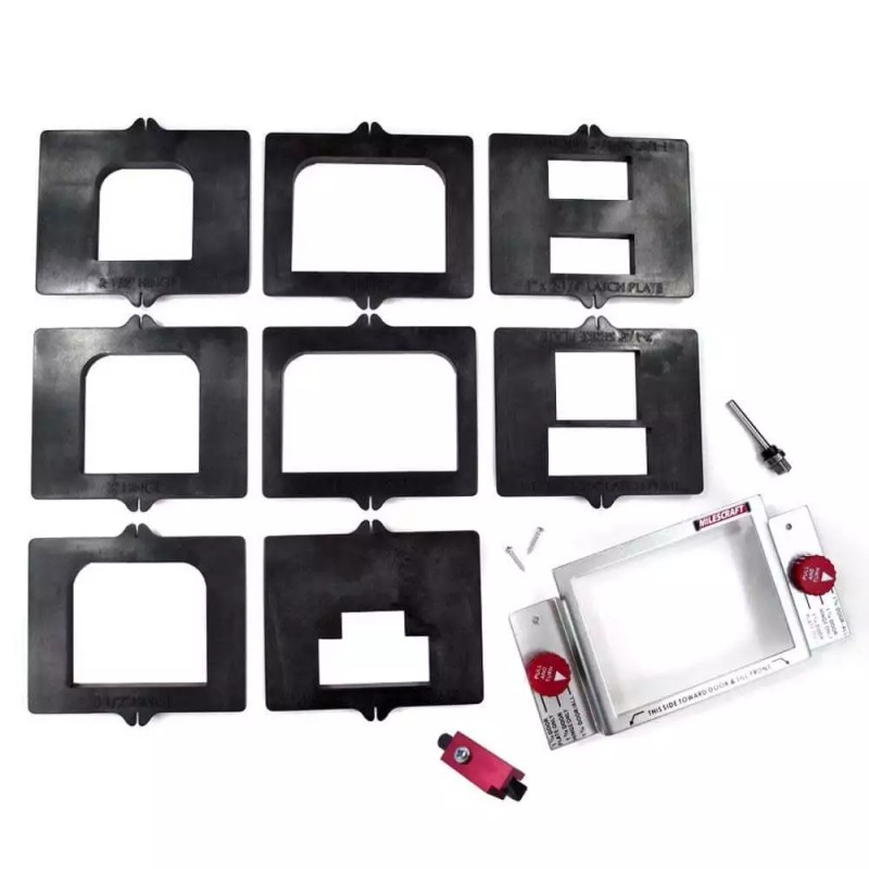Easy to use drop-in template system for routing common door hinges and plate mortises. Rout matching mortises for common hinges, strike and latch plates in 1-3/8 and 1-3/4 In doors. Easy to use kit features clearly marked templates and a durable metal template frame and includes a 1/2 In bearing guided router bit. The included corner chisel makes square corners easily. Door mortise kit provides an easy and ready-to-use drop-in template system for routing common door hinge and plate mortises The included corner chisel makes it easy to have square corners when using mortise templates Easy to use drop-in template system eliminates confusing pegs, stops and sight lines