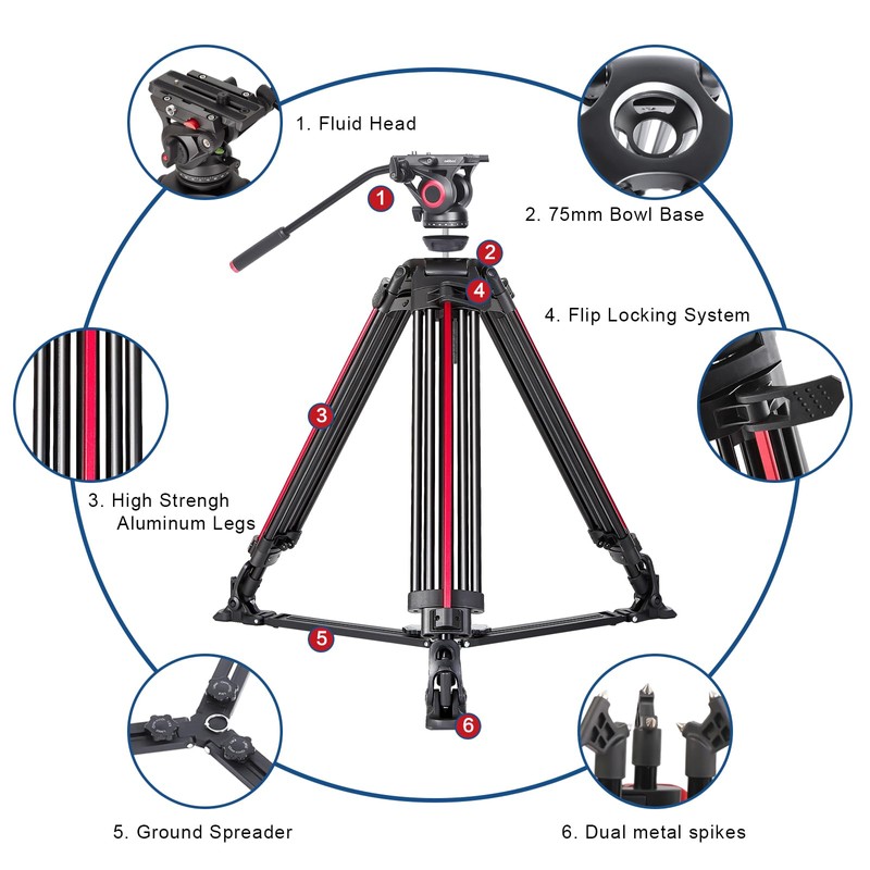 - 【Superior quality and stability】 This fluid head tripod is made of high quality aluminum alloy, double tube thickness of 14-20mm, bowl diameter of 75mm. more stable structure compared to other products, designed with additional ground spreader and horseshoe shaped feet, for ensuring your camera will not shake. It is able to withstand a maximum weight of 10kg and is suitable for DSLRs, camcorders and other camera equipment.