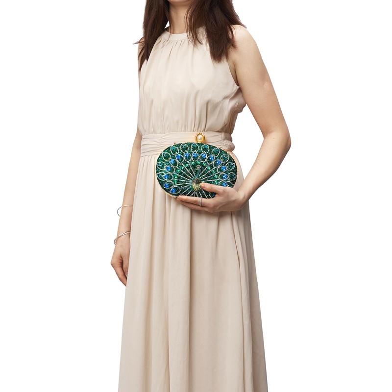 Milisente Clutch Purses For Women Crystal Peacock Evening Bag Rhinestone Oval Formal Handbag With Bow Pearl Closure (Green)