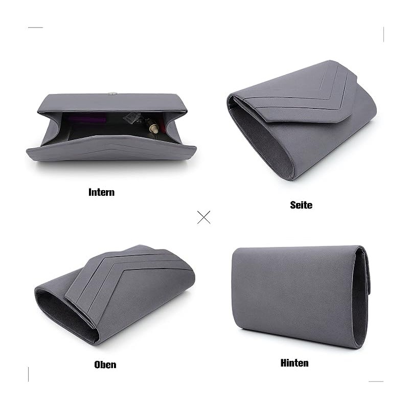 - Features: Elegant clutch design, magnetic buckle with internal zip.
