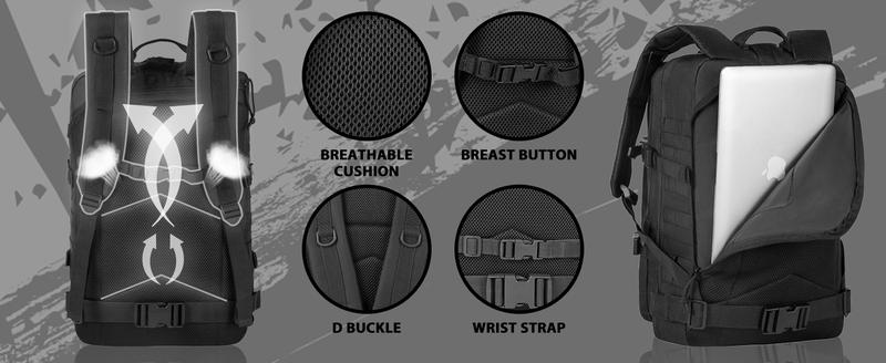 【MOLLE WEBBING DESIGN】Equipped with the MOLLE system on the front and sides, the MOLLE webbing is used to attach additional tactical pouches or gear as a 3-day Assault Backpack Combat MOLLE Backpack. Bottom straps can be used to secure a tent or sleeping pad.