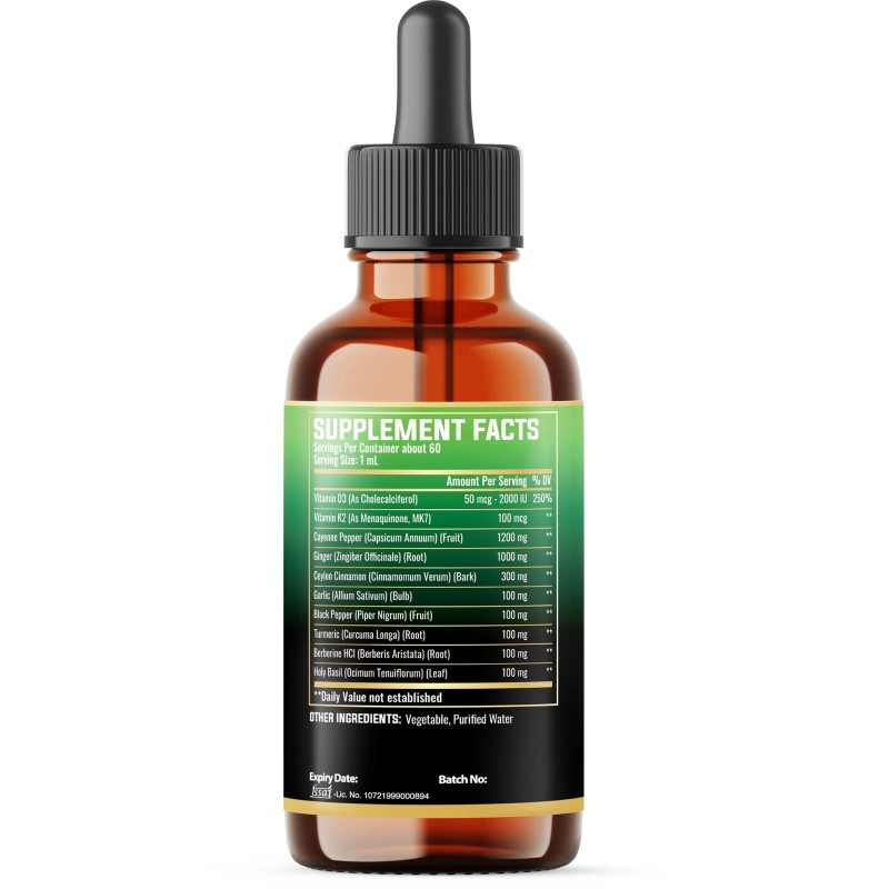 • ✔️ Powerful Formula: A blend Cayenne Pepper Tincture of Vitamin D3, Vitamin K2, Cayenne Pepper, Ginger, Ceylon Cinnamon, Garlic, Black Pepper, Turmeric, Berberine, and Holy Basil for targeted wellness support.