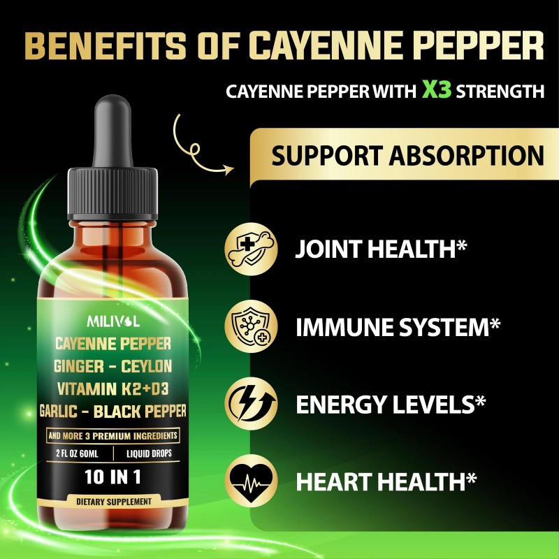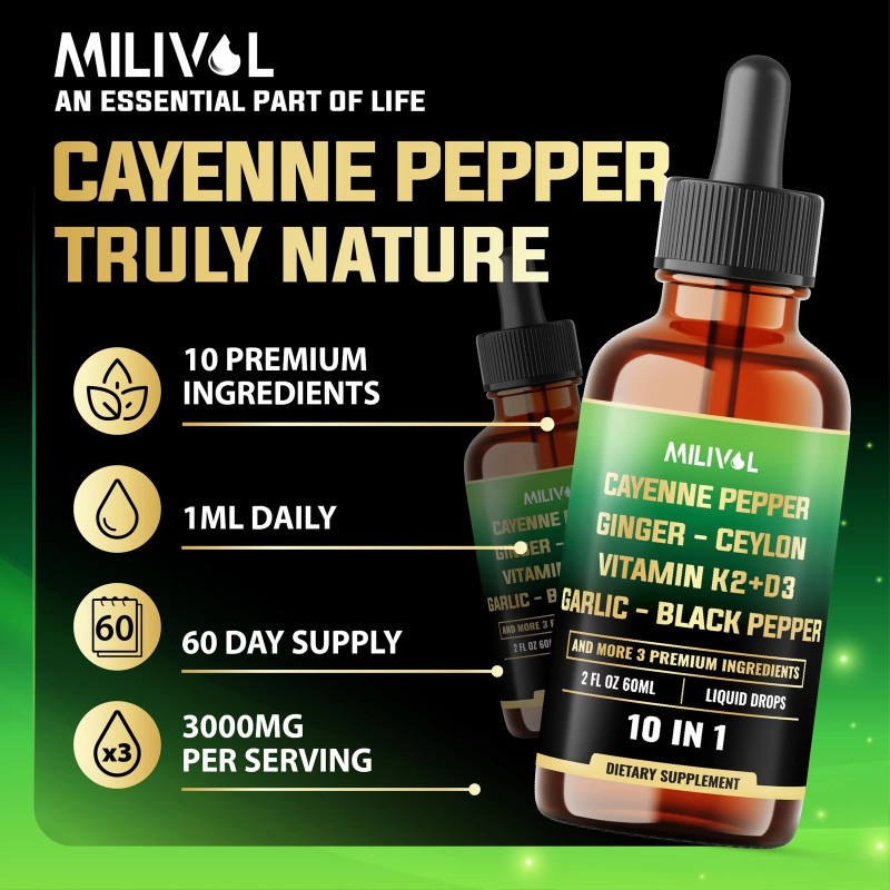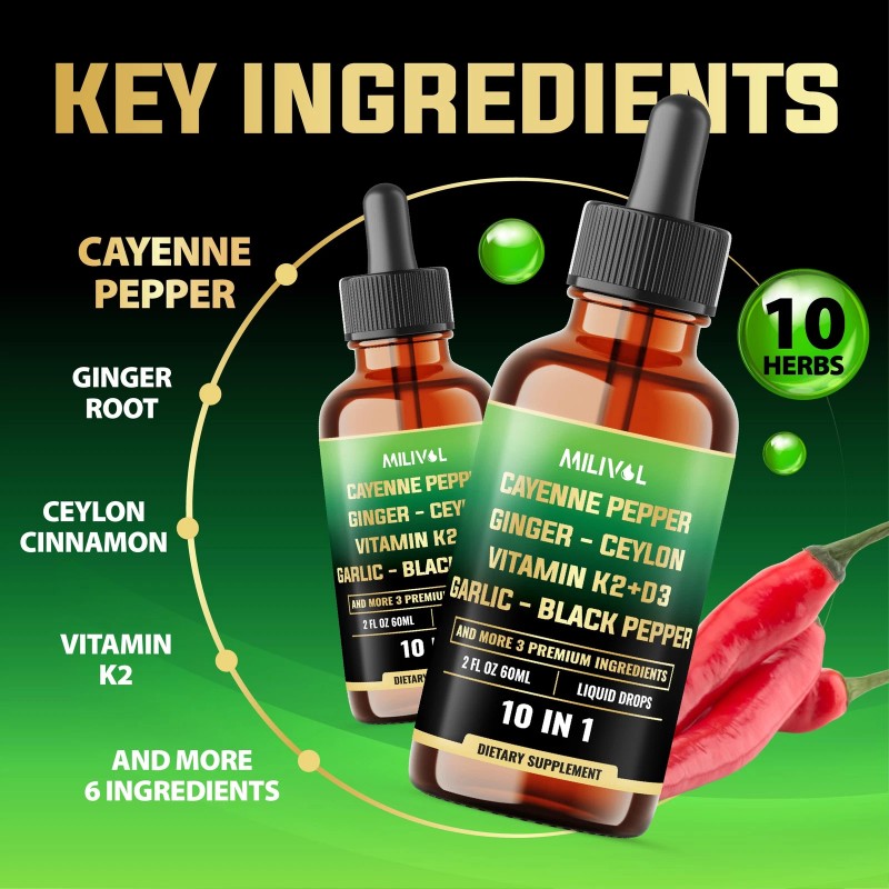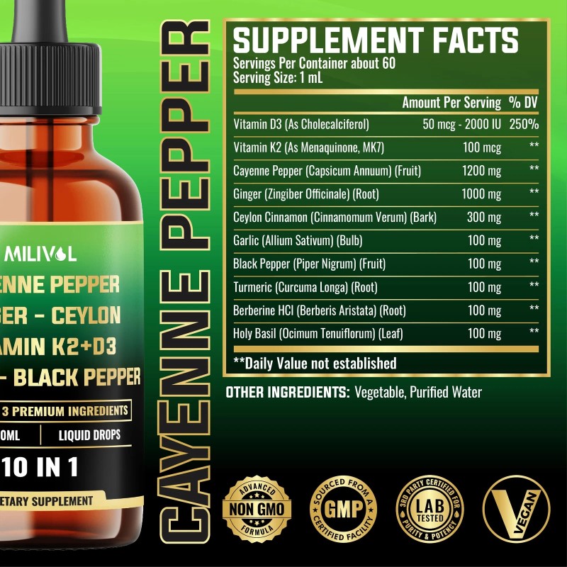MILIVOL 10in1 Cayenne Pepper Liquid Drops + Ginger Ceylon Cinnamon Vitamin D3...