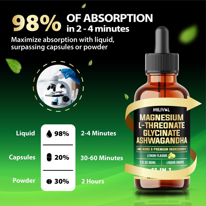 MILIVOL 10in1 Magnesium L-Threonate Liquid Drops with Magnesium Glycinate, Ashwagandha, Vitamin D3, C, B6 & 4 Other Ingredients - 2 Fl Oz - Lemon Flavor