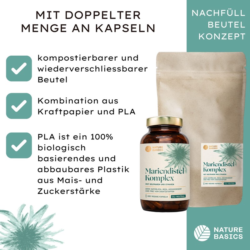 - High quality and sustainable – Our milk thistle complex powder is without chemical and artificial ingredients and therefore completely natural. Our dietary supplements are manufactured in strictly tested and certified facilities in Germany. With our climate-positive concept, we also offer 100% sustainability.