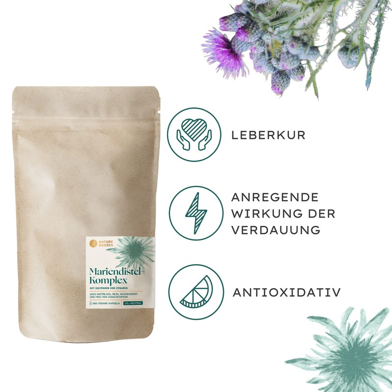 - Supply for 12 months - 360 capsules with high-dose 250 mg milk thistle extract (80% silymarin) and 200 mg artichoke extract (min. 2.5% cynarin) per daily dose (1 capsule). We at Nature Basics recommend 1 natural milk thistle complex capsule per day. Can preferably be used as a liver treatment.