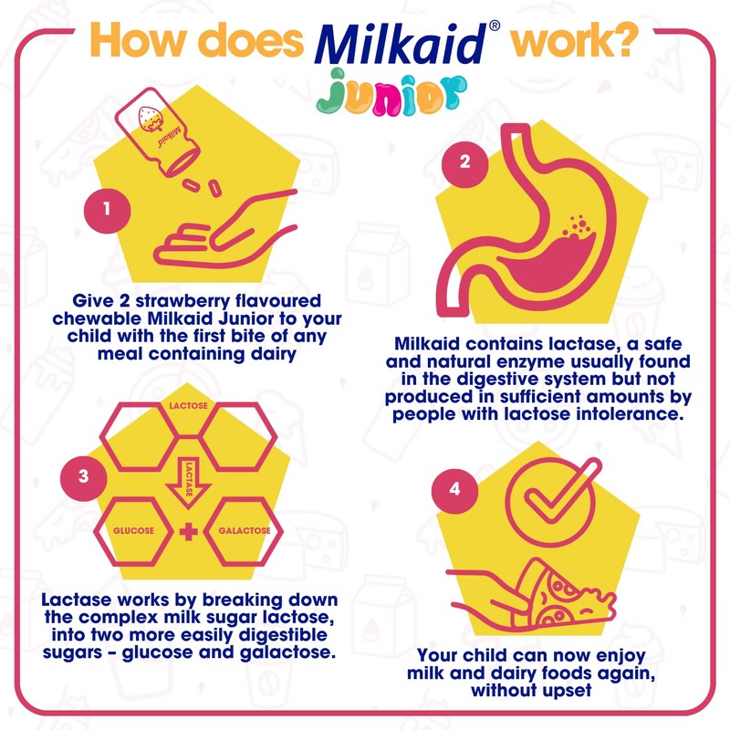 - NEW IMPROVED FORMULATION Milkaid has undergone a new and improved formulation as a result of consumer feedback on the taste of our products. Our products still come in the signature Raspberry (Milkaid Tablet) and Strawberry (Milkaid Junior) flavours. Whilst there will not be noticeable differences to the size, colour or shape of the tablet, consumers may notice an improvement to the taste and sweetness level of the tablet. There are no changes to the nutritional information, and still