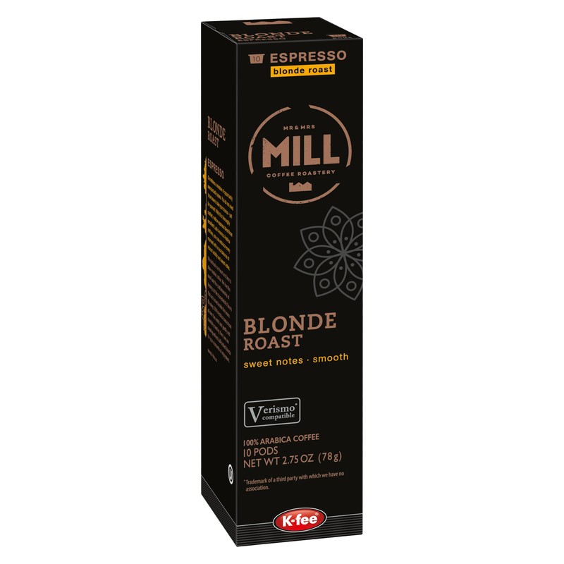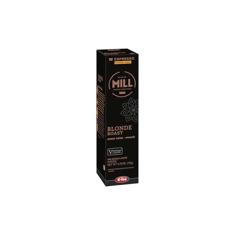 - MR & MRS MILL BLONDE ROAST ESPRESSO K-fee & VERISMO COMPATIBLE CAPSULES: With this thoroughly crafted, mellow espresso blend from excellent Central and South America Arabica coffees, you can embrace every moment with a balance of vibrant acidity and sweet notes.