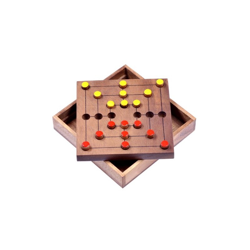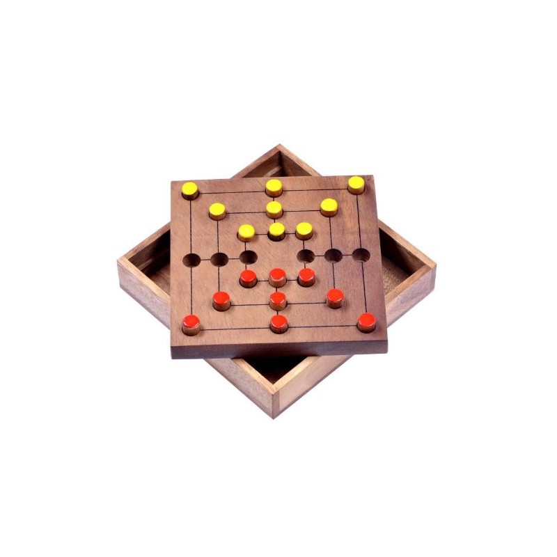 Each player takes turns placing a stone on the empty playing field and tries to form mills, i.e. 3 stones horizontally or vertically along a line. If this succeeds, he may remove an enemy stone, but not a stone from a mill. Once all the bricks are set, players take turns moving their stones one step in any direction and continue to try to shape mills and bring enemy stones to themselves. If you have only one token left or cannot move their bricks.