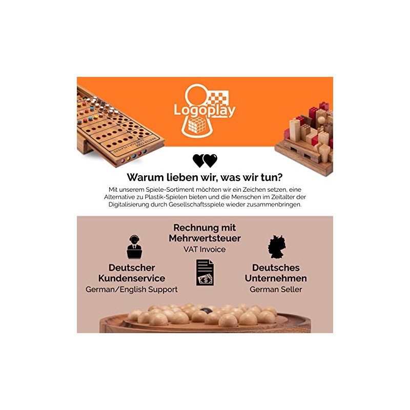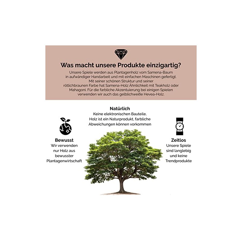 This game is made from environmentally friendly plantation wood from the Samena tree (Lat. Pithecellobium Saman) elaborately handmade and made with simple machines. With its beautiful texture and reddish brown color, Samena wood is similar to teak or mahogany. A treatment with teak oil gives the wood a honey-coloured, warm tone as well as a matte silk shine that does not wear out even after long use.