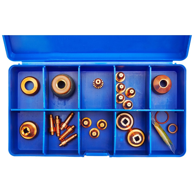 Consumable kit with characteristics of 40 AMP, application with plasma cutting for use with manufacturing number XT40. It includes 5 electrodes (249926), 3 tips (249927), 1 swirl ring (249931), 1 retaining cup (249932), 1 O-ring (249969), 1 grease pack (252951), 2 drag shields (249930), 1 drag shield (251960), 1 shield deflector (249933), 5 tips (249928), 1 gouge tip (249934), 1 gouge shield (249936).