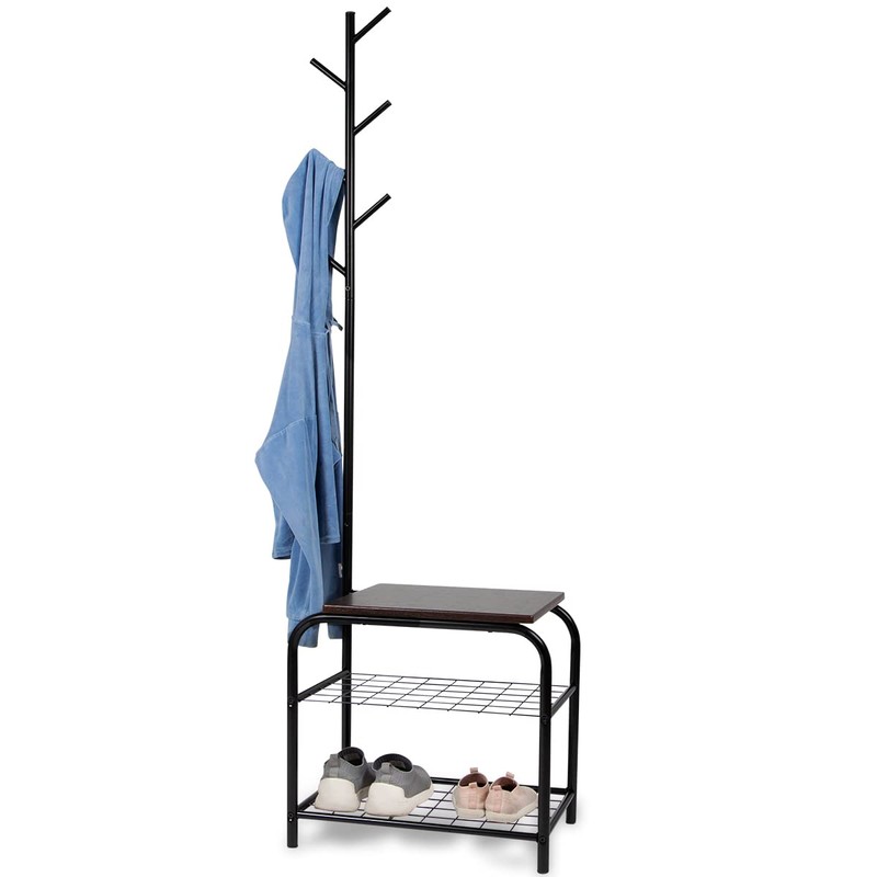- All-in-1 coat rack: a comfortable seat with 6 hooks and 2 shelves to provide ample storage for your jackets, scarves, shoes and mudroom gear.