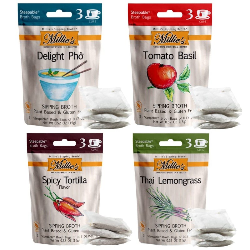 MILLIE'S SIPPING BROTH Steepable Vegetable Broth with Savory Seasonings for Snack Urges | Vegan, Keto, Gluten Free, Intermittent Fasting, and natural | (4 Pack Assortment - 12 Broth Bags Total)