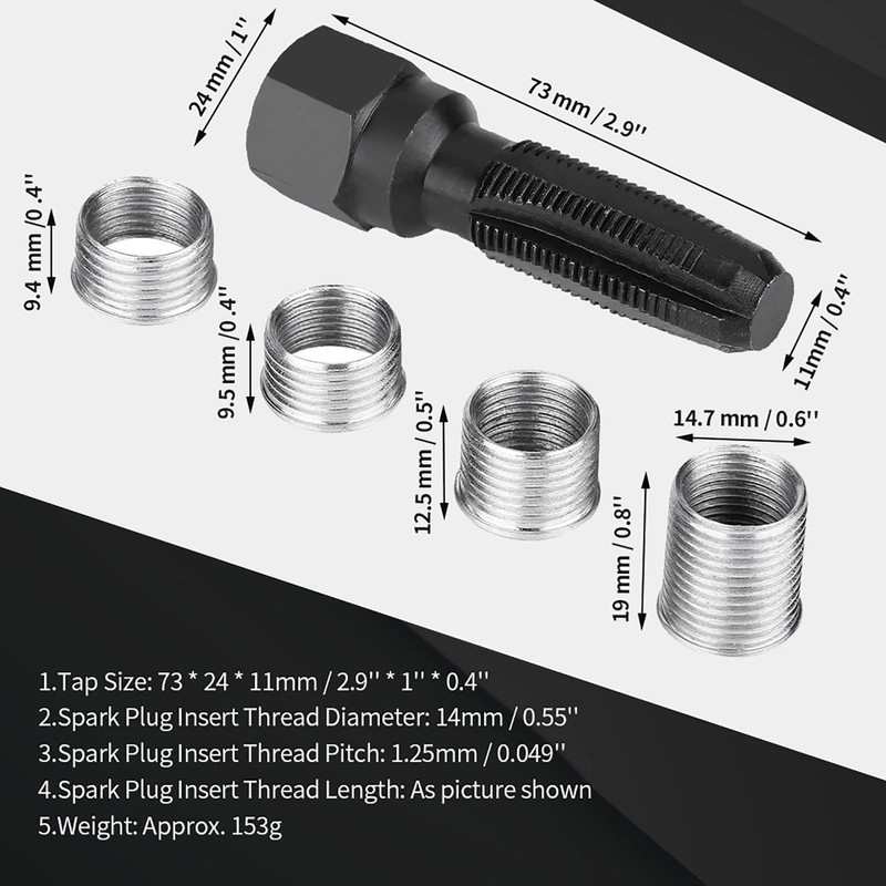 - Versatile Inserts for Various 14mm Sparks Plugs: This sparks plug re-thread tap tools set comes with four sizes of inserts, designed to accommodate different 14mm thread size sparks plugs. Whether you're repairing a car, motorcycle, or small engine, this Metric Thread Repair Tools kit ensures a great fit every time.