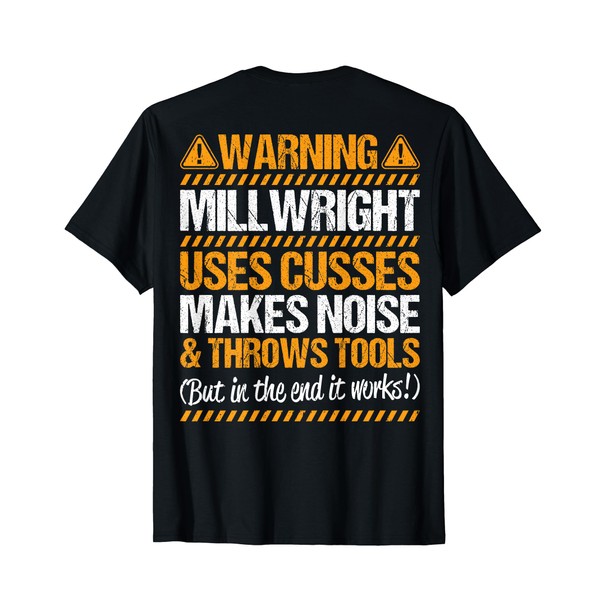- This design for millwrights says: 'Warning - Millwright - Uses Cusses, Makes Noise & Throws Tools (But In The End It Works!)'. A great design for a millwright.