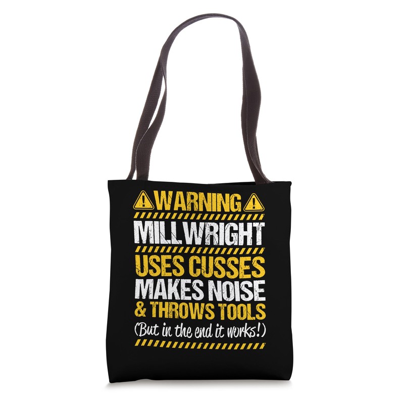 - This design for millwrights says: 'Warning - Millwright - Uses Cusses, Makes Noise & Throws Tools (But In The End It Works!)'. A great design for a millwright.