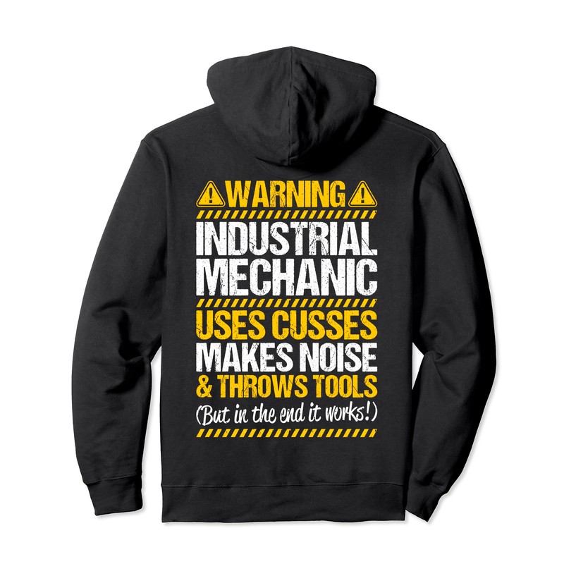 • This design for industrial mechanics says: 'Warning - Industrial Mechanic - Uses Cusses, Makes Noise & Throws Tools (But In The End It Works!)'. A great design for an industrial mechanic.