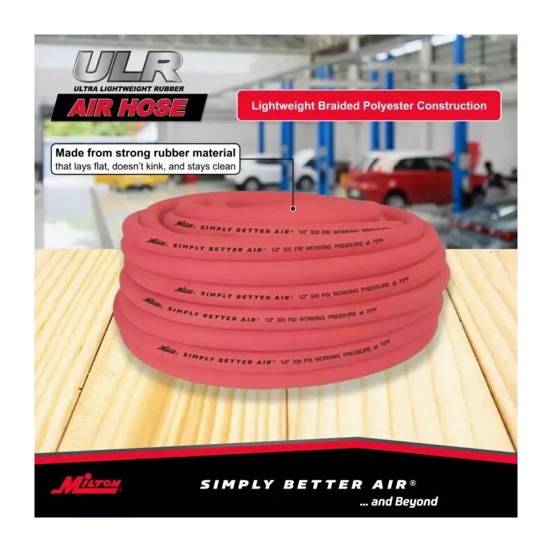 Built to withstand every extreme, the Milton® 1/2" Ultra Lightweight Rubber Air Hose offers the durability of typical rubber hoses while maintaining the ultra-lightweight convenience of a hybrid hose. The oil-resistant core tube and cover resist abrasion and strain and will not break down over time, while the thread ends are built with bend restrictor ergonomic handle grips for leak-resistant performance. Forty percent more lightweight than traditional rubber hoses, this lightweight hose connector offers the flexibility of functioning in extreme conditions. The strong rubber material allows for optimal performance in temperatures ranging from -50°F to 190°F, with a Maximum Operating Pressure of 1,200 PSI and a Max Working Pressure of 300 PSI. The flexibility and strong ozone resistance ensure that the hose will not kink or leak, making it easy to carry, lift, and maneuver in the field. The hose can be easily rolled up, transported between work environments, and used in extreme weather. A 10-year extended warranty protects against repair costs. With a 100 foot reach, made out of strong rubber material, this non-tangle bulk hose is built to last.