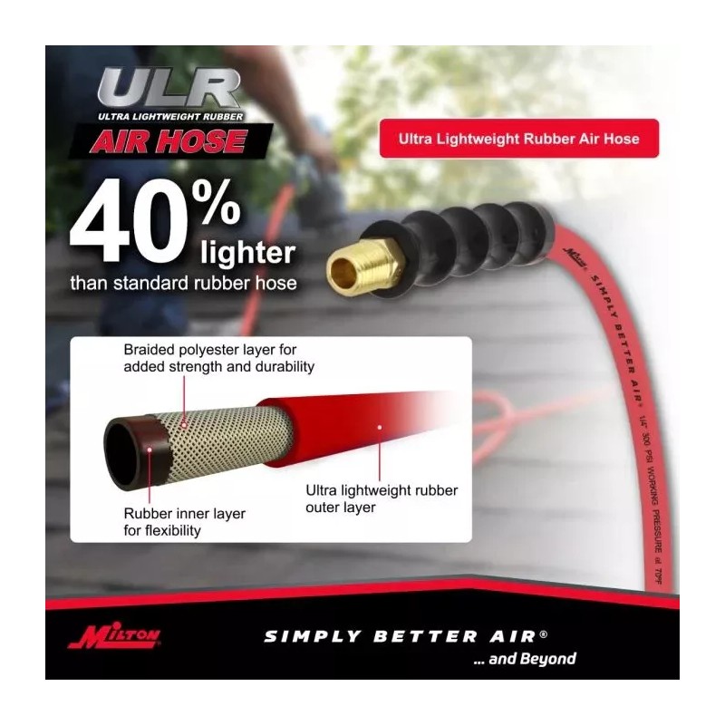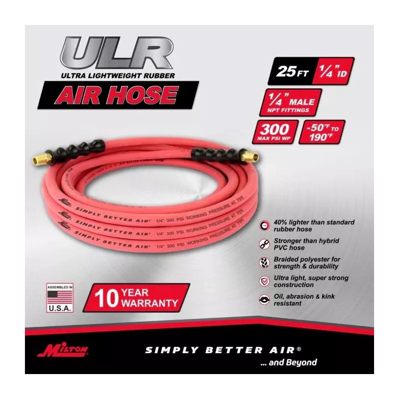Built to withstand every extreme, the Milton® 1/4" Ultra Lightweight Rubber Air Hose offers the durability of typical rubber hoses while maintaining the ultra-lightweight convenience of a hybrid hose. The oil-resistant core tube and cover resist abrasion and strain and will not break down over time, while the brass National Pipe Fitting 1/4" thread ends are built with bend restrictor ergonomic handle grips for leak-resistant performance. Forty percent more lightweight than traditional rubber hoses, this lightweight hose connector offers the flexibility of functioning in extreme conditions. The strong rubber material allows for optimal performance in temperatures ranging from -50°F to 190°F, with a Maximum Operating Pressure 1,200 PSI and a Max Working Pressure of 300 PSI. The flexibility and strong ozone resistance ensure that the hose will not kink or leak, making it easy to carry, lift, and maneuver in the field. The hose can be easily rolled up, transported between work environments, and used in extreme weather. A 10-year extended warranty protects against repair costs. With a 25 foot reach, made out of strong rubber material, this non-tangle hose is built to last.
