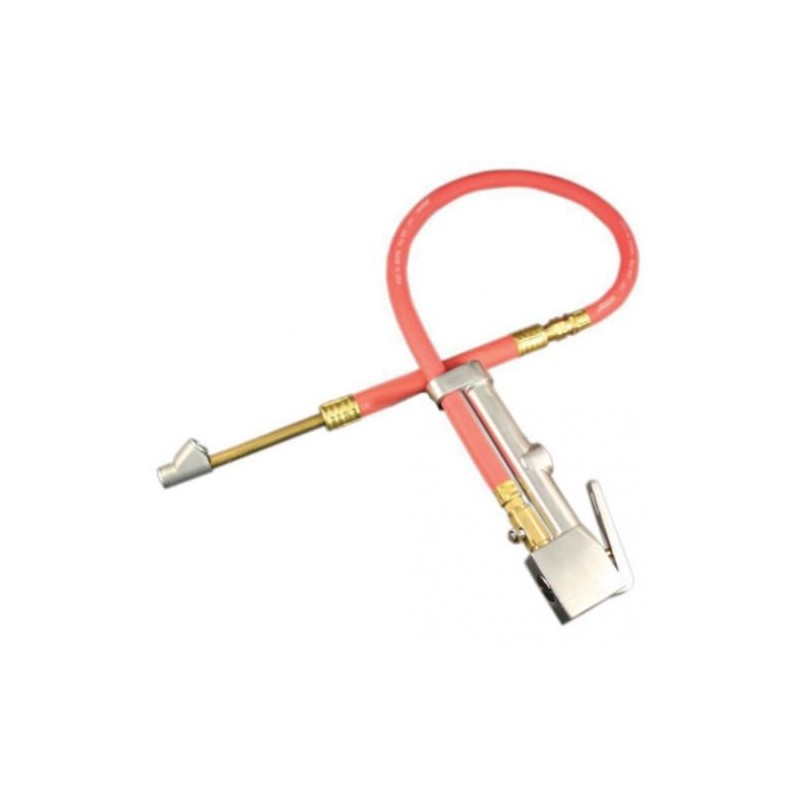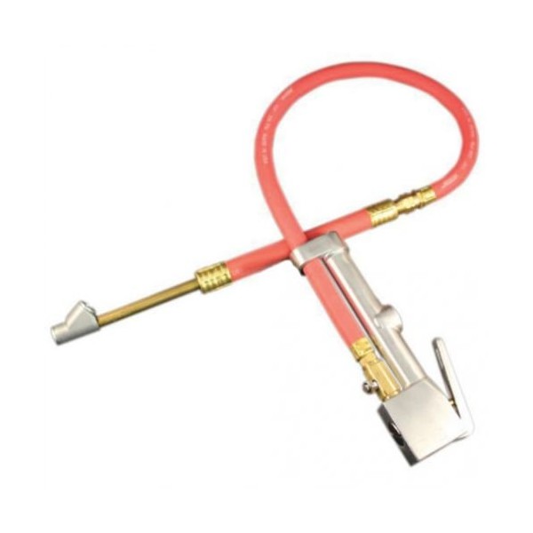 - Extended reach tire inflator gage has a 12" swivel end reach and a dual head straight foot chuck