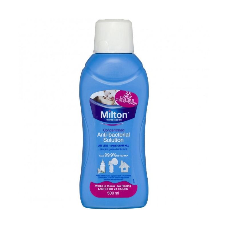 Milton Formula Concentrated Anti-bacterial Solution available in 500mL which is an all New Double Concentration. Milton Solution kills 99.9% of germs and sterilises in just 15 minutes. No rinsing required. Solution lasts for 24 hours. Milton fluid is composed of 99% water and naturally occurring materials which when diluted 1 in 33, match exactly with body tissues and fluids. The product is safe and effective at protecting the body.