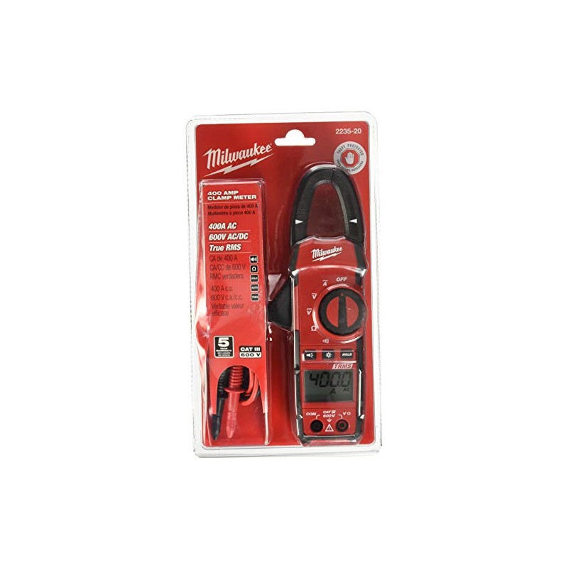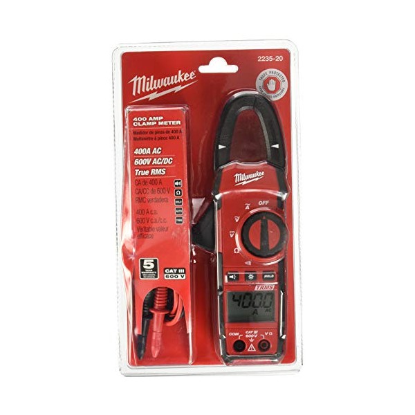 Heavy duty True-RMS electrical current tester for professional residential, commercial, and industrial applications. The perfect tool for the professional electrician; includes all the features that are needed to get the job done in the field, on-site or in the plant. Milwaukee 2235-20 Clamp Meter features: jaw size of 1.0-inch measuring up to 350 MCM cable; rated CAT III 600V; current measurement to 400 amps AC; voltage measurement to 600 volts AC/DC; LED Work Light to improve task lighting; resistance measurement to 4000 ohms; test for continuity; black on white display and backlight for easier reading; rugged over-molding for increased durability and user grip; includes one (1) electrical test lead set, two (2) AAA batteries, and manual; covered by 5 year warranty.