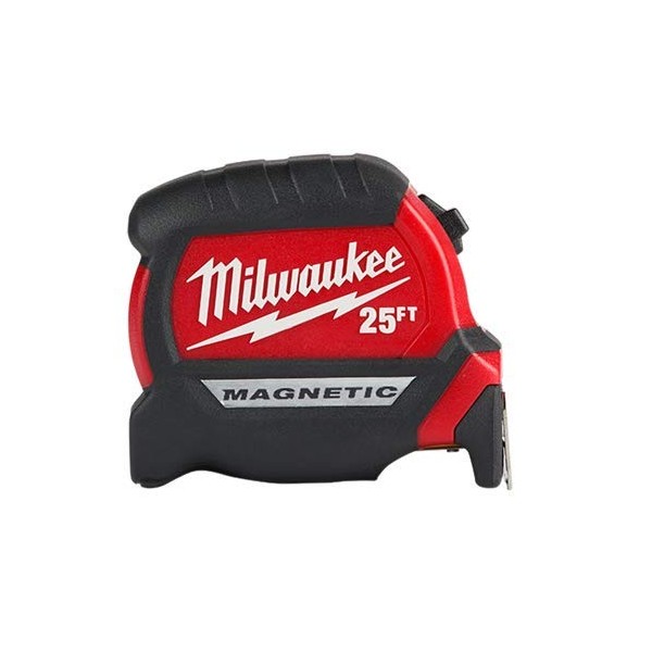 Milwaukee 48-22-0325 Tape Measure, 25 ft L Blade, 1 in W Blade, Steel Blade, Black/Red Pack of 1 Our 25 ft compact wide blade magnetic tape measure has up to 15 ft of reach and a magnet that easily attaches to EMT and steel studs. The tape is wear and impact-resistant with nylon blade protection and an additional anti-tear coating on the first 6 in of the blade, reducing tape tear. Built-to-withstand the jobsite, the compact measuring tapes are constructed with a five-point reinforced frame for impact resistance.