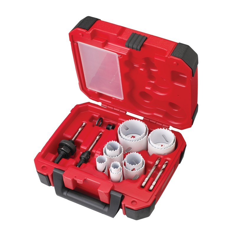 Milwaukee Electric Tool Corporation introduces Ice Hardened hole saws, a new generation of hole saws that offer up to 50% longer life than the competition and are ideal for metal and wood cutting in a wide variety of HVAC, electrical, plumbing and maintenance/repair applications. Milwaukee Ice Hardened products utilize a proprietary cryogenic hardening process that improves upon traditional heat treat processes. Unlike surface coatings that wear away, cryogenics harden to the core by minimizing soft metal (austenite) and creating more hard metal (martensite). The result is a product that is more consistently hard throughout, resulting in life up to 50% longer than the competition. Milwaukee Ice Hardened hole saws also feature Matrix II bi-metal construction for greater durability and a unique precision-ground tooth geometry for faster cutting. A positive rake angle cuts more aggressively while deeper gullets quickly remove chips. A radiused back face reduces stress on the teeth, ensuring that the blade delivers optimum life and speed. Functional slot geometry allows for a standard slotted screwdriver to fit completely underneath the plug for easier plug removal. Kit Includes: Eleven (11) hole saws: 3/4", 7/8", 1", 1-1/8", 1-3/8", 1-1/2", 1-3/4", 2", 2-1/8", 2-1/4", 2-1/2"; Two (2) arbors: 49-56-7010, 49-56-9100; Two (2) drill bits: 49-56-8010; One (1) adapter: 49-56-6560; One (1) spacer: 49-67-0120; Space for additional hole saws