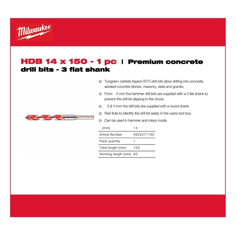 Milwaukee Concrete Drill Bit Masonry Drill Tool Shank with 3 Sides Diameter 14 mm Length 150 mm 1 Piece