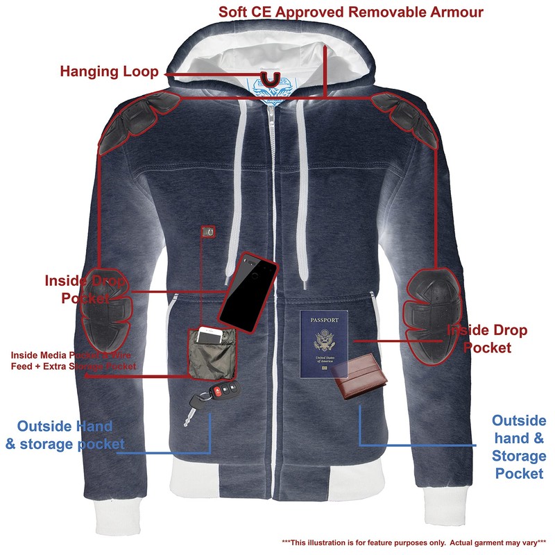 - Shoulders and Elbows Reinforced with Kevlar Fiber Thread by DuPont - Adjustable Hoodie Drawstring Elastic Cuffs and Waistband