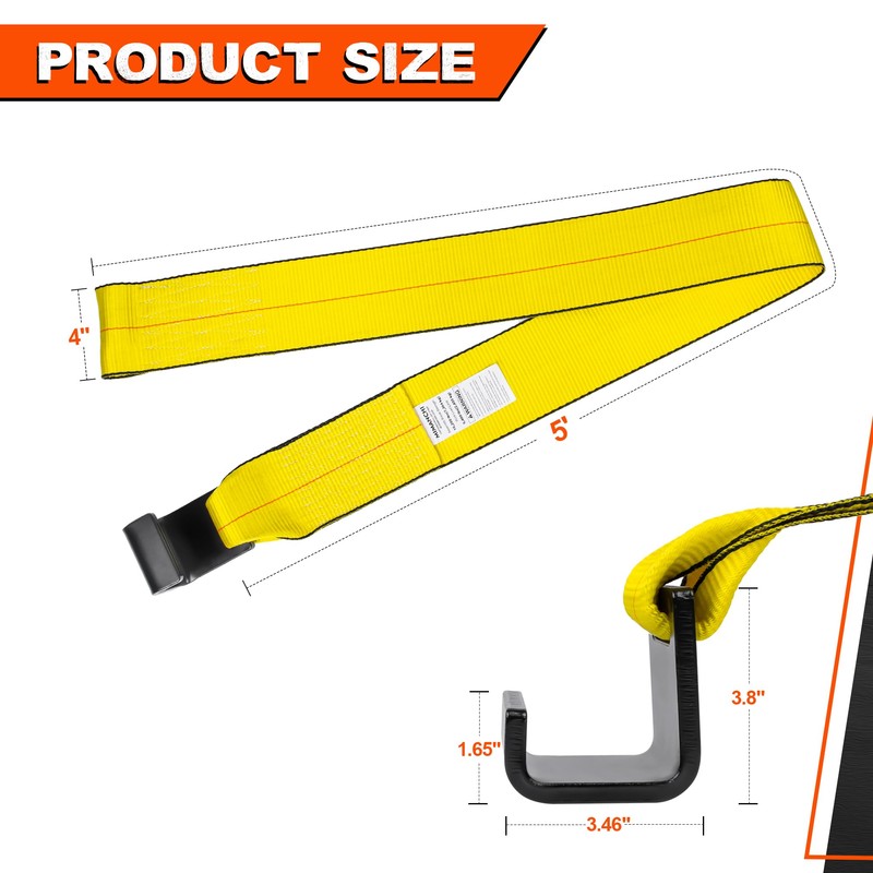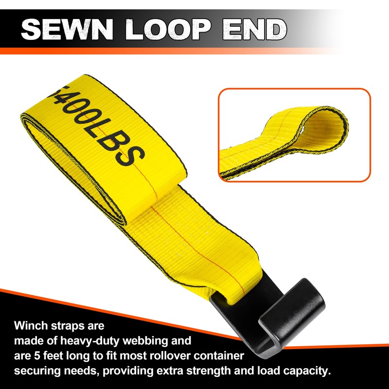 - 【Specifications】Winch straps are made of 4 inch wide yellow polyester straps, which are tough and durable;Working load limit: 5,400 pounds, Breaking strength:16,200 pounds;They are very suitable for fixing goods on trailers, trucks, and flatbed trucks