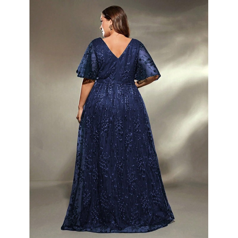 Plus Size Women's V Neck Ruffles Flutter Sleeve Sequins Embroidered Lace A Line Maxi Dress for Wedding Party Evening