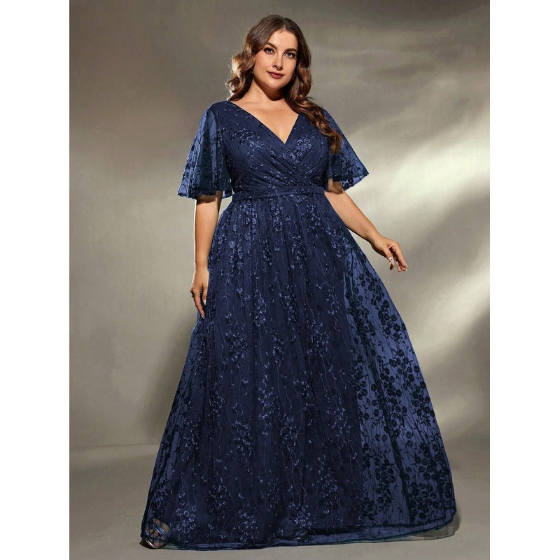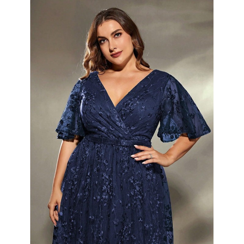 MIMIFINA Plus Size Women's V Neck Ruffles Flutter Sleeve Embroidered Lace A Line Maxi Dress for Wedding Party Evening A-Navy Blue