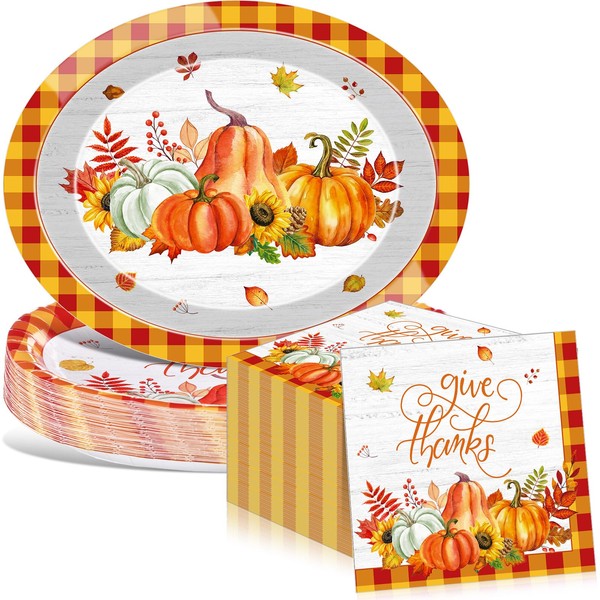 Mimorou 100 Pcs Fall Paper Plates and Napkins Sets Disposable Give Thanks Napkins Pumpkin Maple Leaf Oval Plates Dinnerware for Harvest Autumn Thanksgiving Party Decor Serves 50 Guests (Orange Plaid)