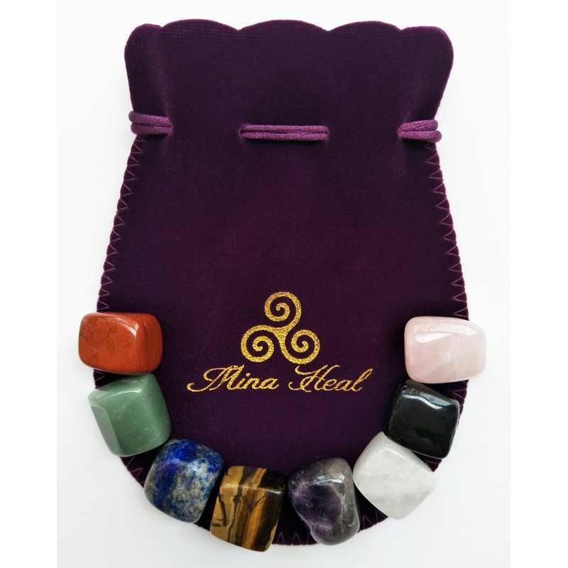 - Set of 8 Chakra Crystal Stones: 1) Aventurine, 2) Rose Quartz, 3) Red Jasper, 4) Tiger Eye, 5) Amethyst, 6) Obsidian, 7) Lapis Lazuli and 8) Clear Quartz.