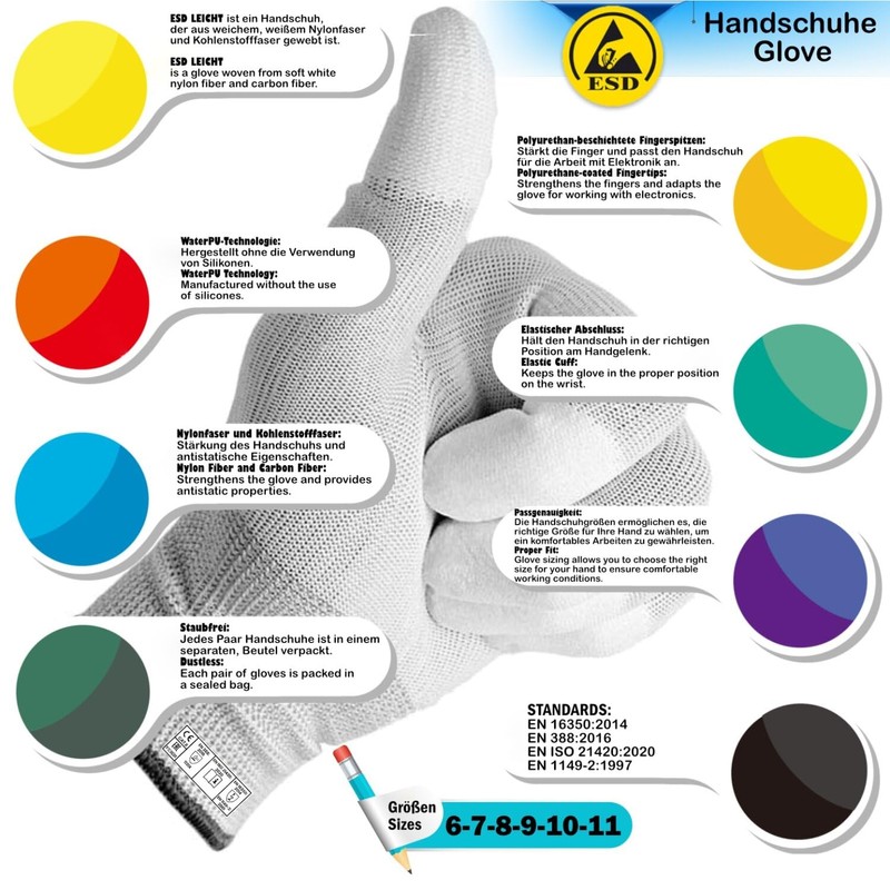 The ESD gloves are the ideal choice for anyone working in electronics, precision mechanics or other precise working environments. These gloves offer maximum freedom of movement and comfort and safe protection against electrostatic discharges (ESD).