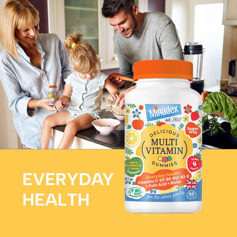 Minadex Premium Multivitamin Gummies 60s for Adults & Children - Vitamin C,D2,B6,B12,B3,E,Folic Acid,Biotin | Immune and Bone Support | Energy | Apple, Strawberry & Lemon flavours | Sugar Free | Vegan