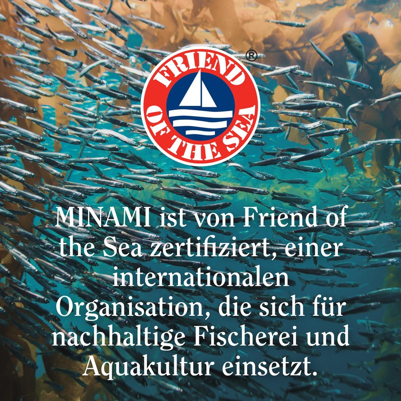 - Umweltfreundlich - MINAMI ist zertifiziertes Mitglied von Friends of the Sea, was bedeutet, dass alle Omega-3-Fischöle von kleinen Fischarten stammen, die nicht vom Aussterben bedroht sind. Diese werden in den frischen Gewässern des Pazifiks in der Nähe von Chile und Peru gefangen.