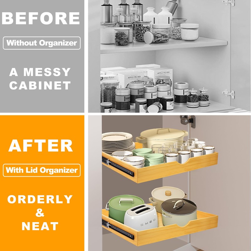 • 【Multipurpose Storage】:MinBoo bamboo pull out cabinet organizer can organize and store your cabinet space for stand mixers, pots, pans, skillets, spices, and other kitchen accessories, cleaning supplies etc.