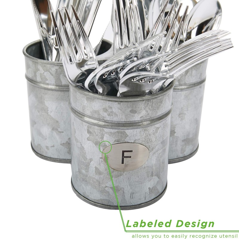 - Capacidad: capaz de contener más de 30 piezas de varios tamaños de cubiertos, de una manera simple, organizada y ordenada. Nuestro soporte plateado para utensilios está hecho para proporcionar la máxima capacidad en un espacio ligero y compacto.