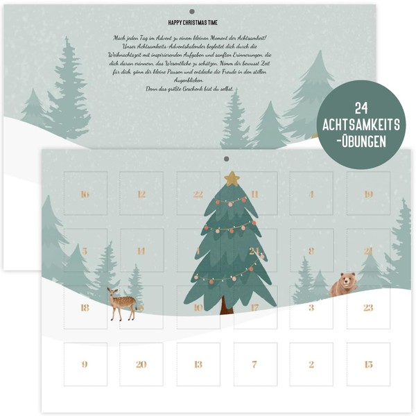 - Mindfulness advent calendar: Start every day with a new mindfulness exercise and enjoy the pre-Christmas season more consciously. Perfect for integrating little moments of peace into everyday life. For example: Take a little break between each task today and breathe deeply.