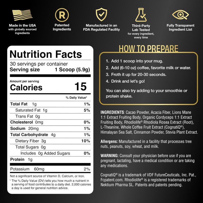 • Infuse a cinna-mocha flavor while providing your brain with a major kick of antioxidant-rich, brain-boosting ingredients that are formulated to naturally improve your mood, energy, and focus.