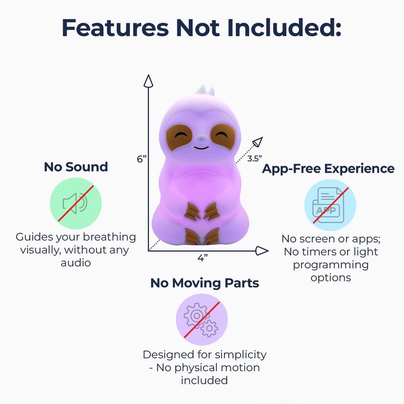 • 🧠 HOW TO USE IT – 3 easy to use Breathing Modes + Nightlight Only Mode. Simply follow fade-in, fade-out color prompts that simulate the (i) 5/5 'balance breath', (ii) 4/7/8 'calming breath', (iii) 4/4/4/4 'box breathing'. Green Sloth - Inhale , Purple Sloth – Hold, Blue Sloth – Exhale. Lightly tap on surface to adjust brightness.