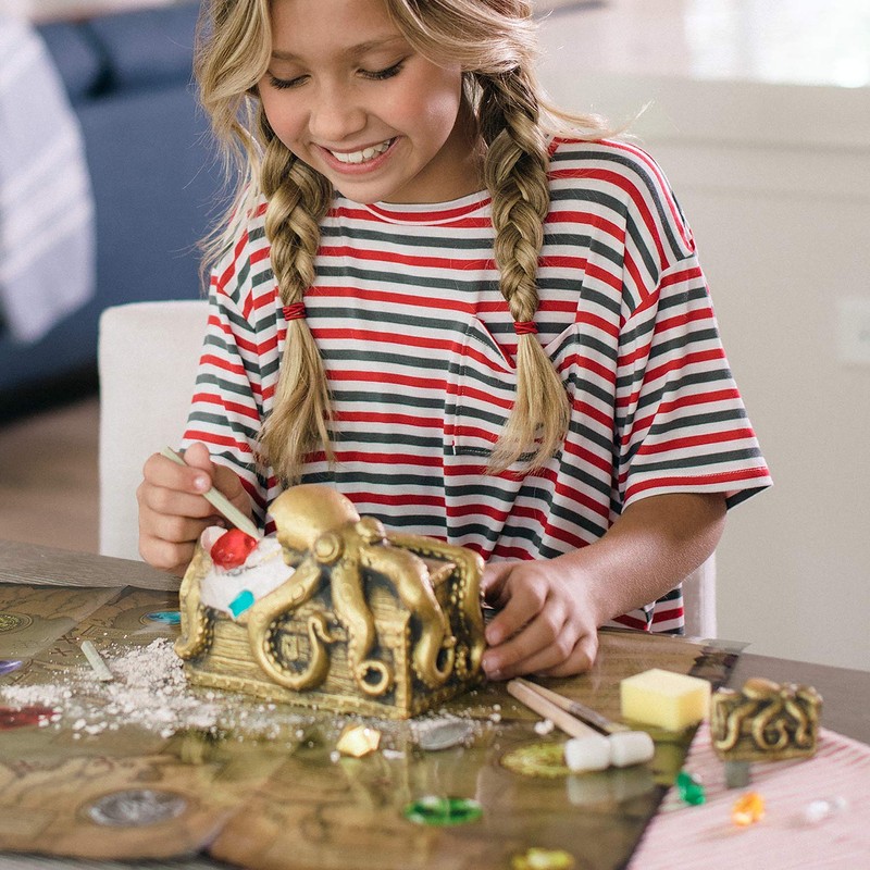 - Discovery Toys: Soak the treasure chest in water, then chisel away to discover your pirate treasures. The included mini dig contains an extra treasure! Rinse them off for a collection of pirate loot.